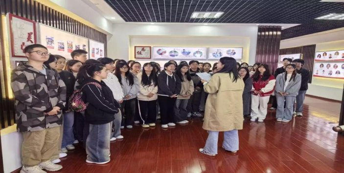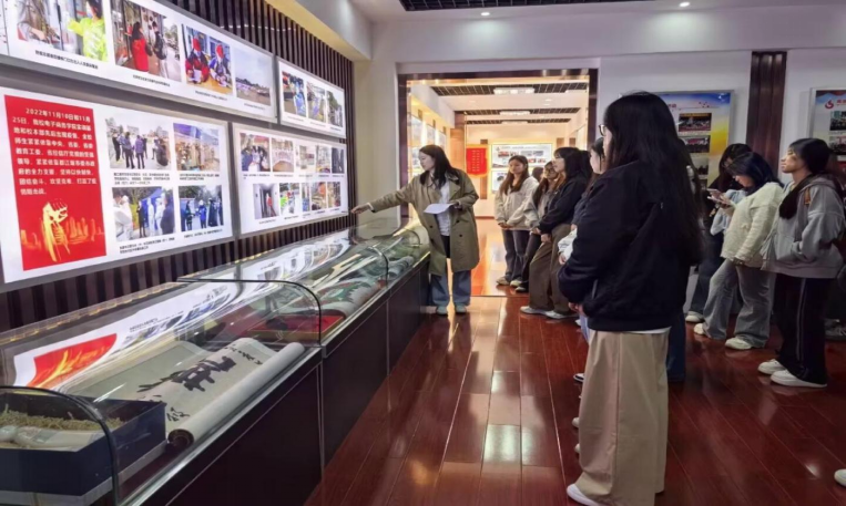 罗江结合老照片、实物展品与纪实影像,系统讲解学校发展脉络,从早期扎根职业教育、助力地方产业培育的探索,到近年推进教育教学改革、聚焦技能人才培养的创新,从校训“明德强技 行健精艺”的提出背景,到党建引领下校企合作、技能竞赛的亮眼成果。同时,她以“蜂巢”辅导员工作室为例,通过校史学习来践行工作室“以党建引领学风”的理念,从而让学生激发学习热情与奋斗精神。参观过程中,学员们认真聆听、不时提问,对身为“大工商”一员的归属感与荣誉感在“历史+实践”的解读中不断提升。