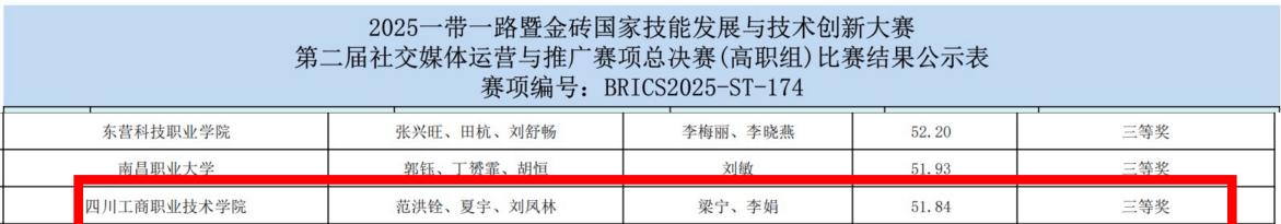 2025一带一路暨金砖国家技能发展与技术创新大赛第二届社交媒体运营与推广赛项总决赛(高职组)成绩正式公布。我校经济管理学院参赛团队在梁宁、李娟老师的悉心指导下,凭借出色的专业素养和创新能力,从众多参赛队伍中脱颖而出,荣获总决赛三等奖,并在前期选拔赛中斩获一等奖。