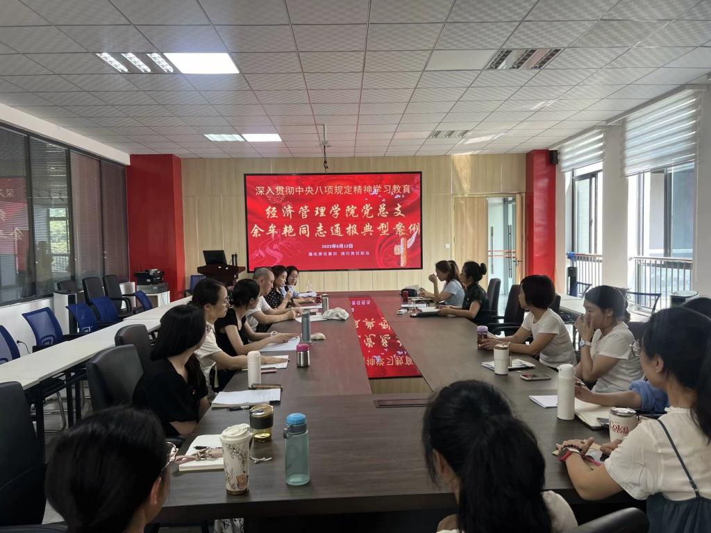 2025年6月12日,经济管理学院党总支联合人文社科基础教育党支部在财经楼205会议室开展深入贯彻中央八项规定精神学习教育集中学习教育专题主题党日活动,本次学习包括理论宣讲、通报典型案例、专题党课、研讨交流四项内容。学院纪委书记向晓岚、经济管理学院党总支、人文社科基础教育党总支全体党员参与本次活动。